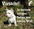 Siehst du mich mal ohne Leine Vorsicht! brauchst du Glück und flotte Beine! In meinem vorigen Leben war ich ein Wolf. | ||